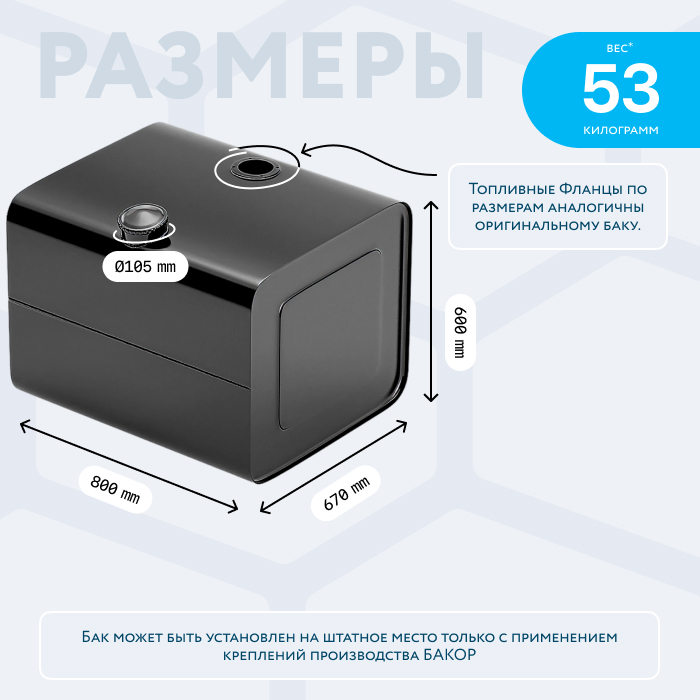 Бак немного отличается по размерам от оригинала, поэтому может быть установлен на штатное место только с применением креплений производства БАКОР к данному баку. Все технологические отверстия соответствуют оригинальным по размерам, резьбам и расположению, поэтому с оригинального бака можно будет переставить топливозаборник. Заливная горловина соответствует оригинальной по диаметру и расположению. Стальная полуоборотная заглушка с клапаном, без замка, а также сливная пробка (1/4" коническая, под шестигранник), включены в стоимость бака без комплектующих.