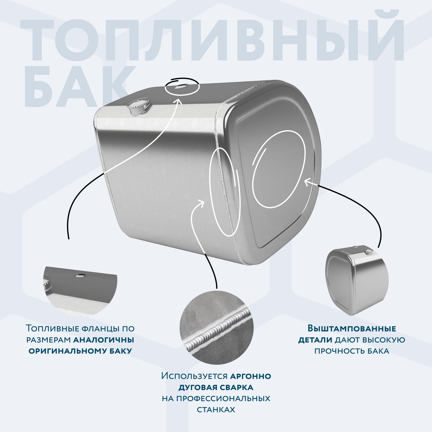 Алюминиевый бак не подвержен коррозии, что делает его более долговечным, а так же сбережет вашу топливную систему. Бак из алюминия в два раза легче стального бака, хотя он и изготовлен из листа увеличенной толщины в 2,5 мм. В конструкции предусмотрены цельные перегородки, которые проварены по периметру. Баки из алюминия так же оснащены заливной горловиной с самозапираемым непроливаемым клапаном (который становится барьером для разлива топлива, а так же становится защитой от попадания мусора в бак при открытой крышке) . Кроме того, однозначно что алюминиевый бак выглядит намного привлекательнее и дороже - где бак в том числе становиться и элементом тюнинга автомобиля. На алюминиеввые баки действует увеличенная гарантия - 36 месяцев.